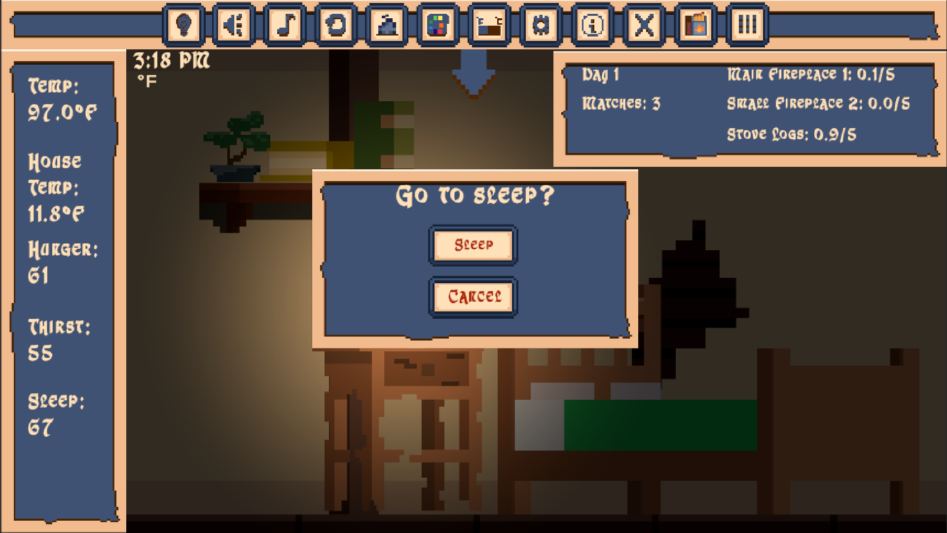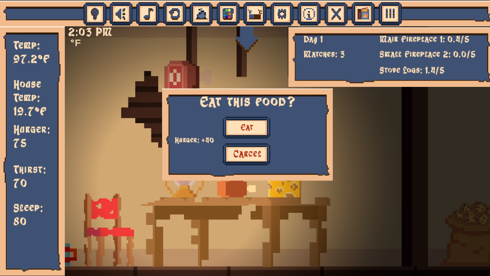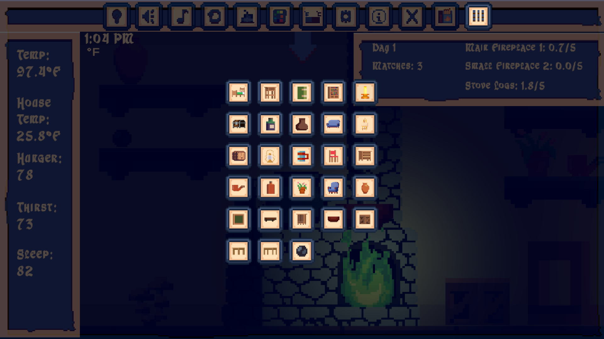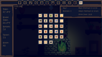 Care for three little fires to survive while restoring and decorating an abandoned medieval home during a relentless blizzard.